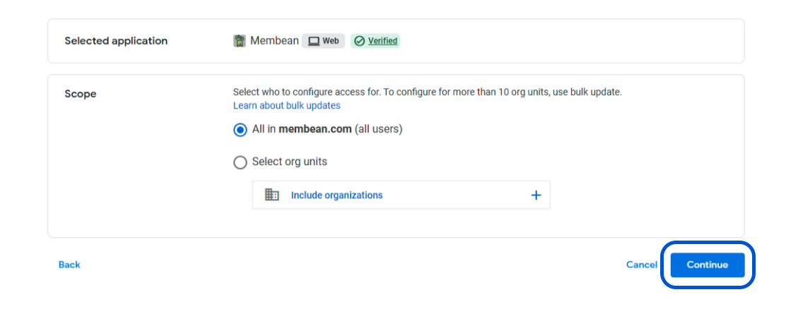 - Set the scope of configuration. This should include all students and teachers who use Membean, so you can leave it as everyone within your organization, or you can select specific groups. Click Continue.