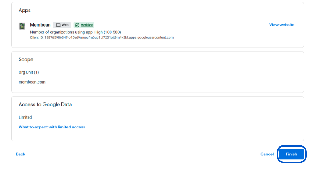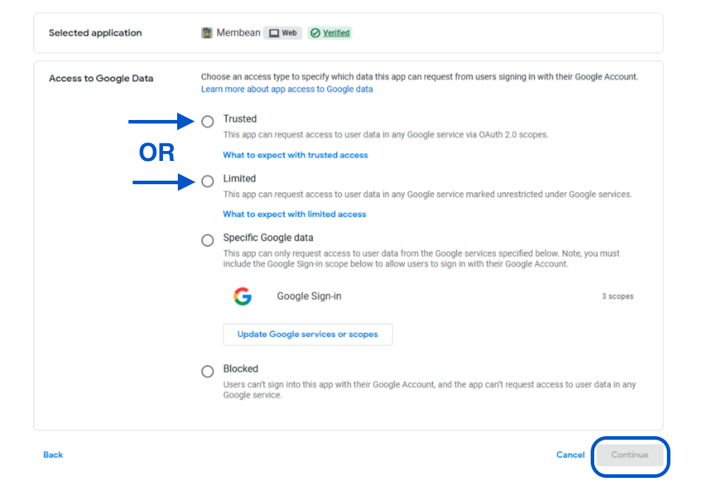 - Set the level of access to Limited or Trusted and click Continue. Limited access is all Membean currently requires. To future-proof your settings, choose Trusted.