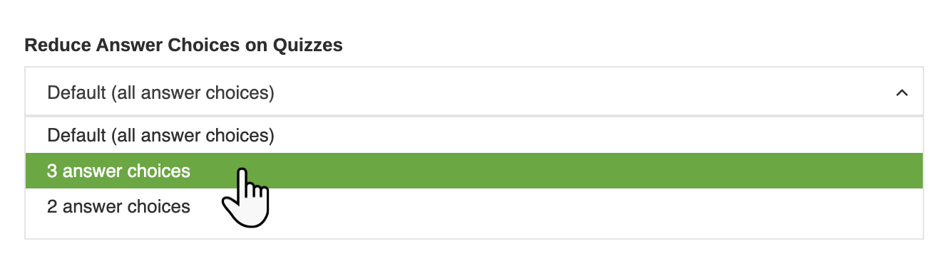 Locate the Reduce Answer Choices on Quizzes setting and choose the maximum number of answer choices the student should see (by default, questions may include 3-4 choices). This limit applies to all quiz questions, including select-all-that-apply (SATA). If you select 3 or 2 here, the student will never see more than that number of choices on any quiz question.
