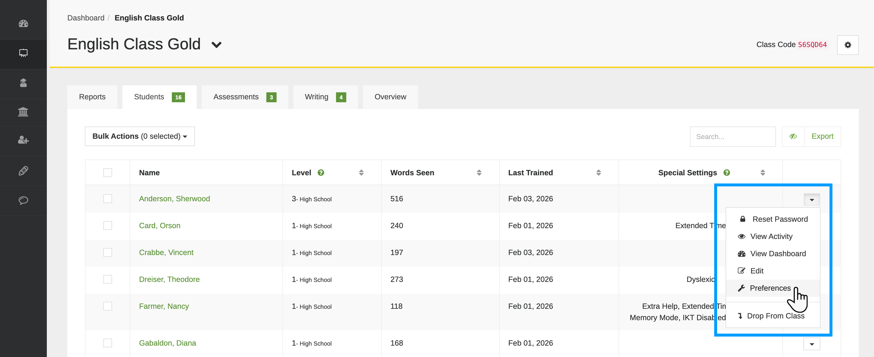 From the Students tab of your class dashboard, find the student who needs reduced answer choices and click Preferences from their dropdown.